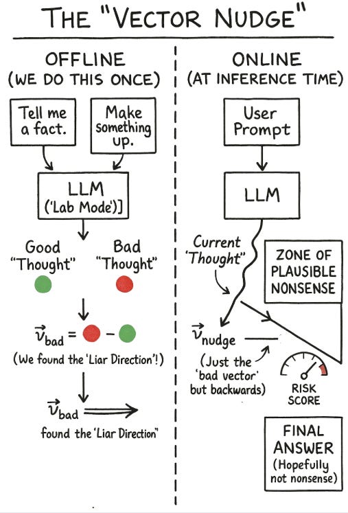 If you could isolate this “hallucination vector,” you wouldn’t need a complex external pipeline to catch lies after they’re told. You could, at the moment of generation, simply “steer” the model away from that direction on the map.